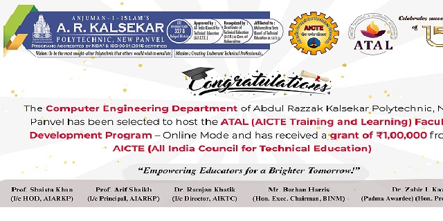 📢 Proud Moment for Computer Engineering department ARKP! ✨We are delighted to share that the Computer Engineering Department of Abdul Razzak Kalsekar Polytechnic has been selected to host an ATAL Faculty Development Program (Online Mode) and has been granted a funding of ₹100000 for the same by AICTE