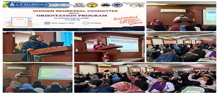 The Women Redressal Committee at AIARKP is proud to organize a special Orientation Program exclusively for all female students. This initiative aims to foster a safe inclusive and empowering environment on campus. Through this session students will be introduced to the functions and responsibilities of the Women Redressal Committee available support systems reporting mechanisms and campus policies related to gender sensitivity and safety. It will also serve as a platform for open dialogue awareness and confidence-building among our female student community. The program is designed to ensure that every student feels informed supported and confident in navigating their academic journey at AIARKP