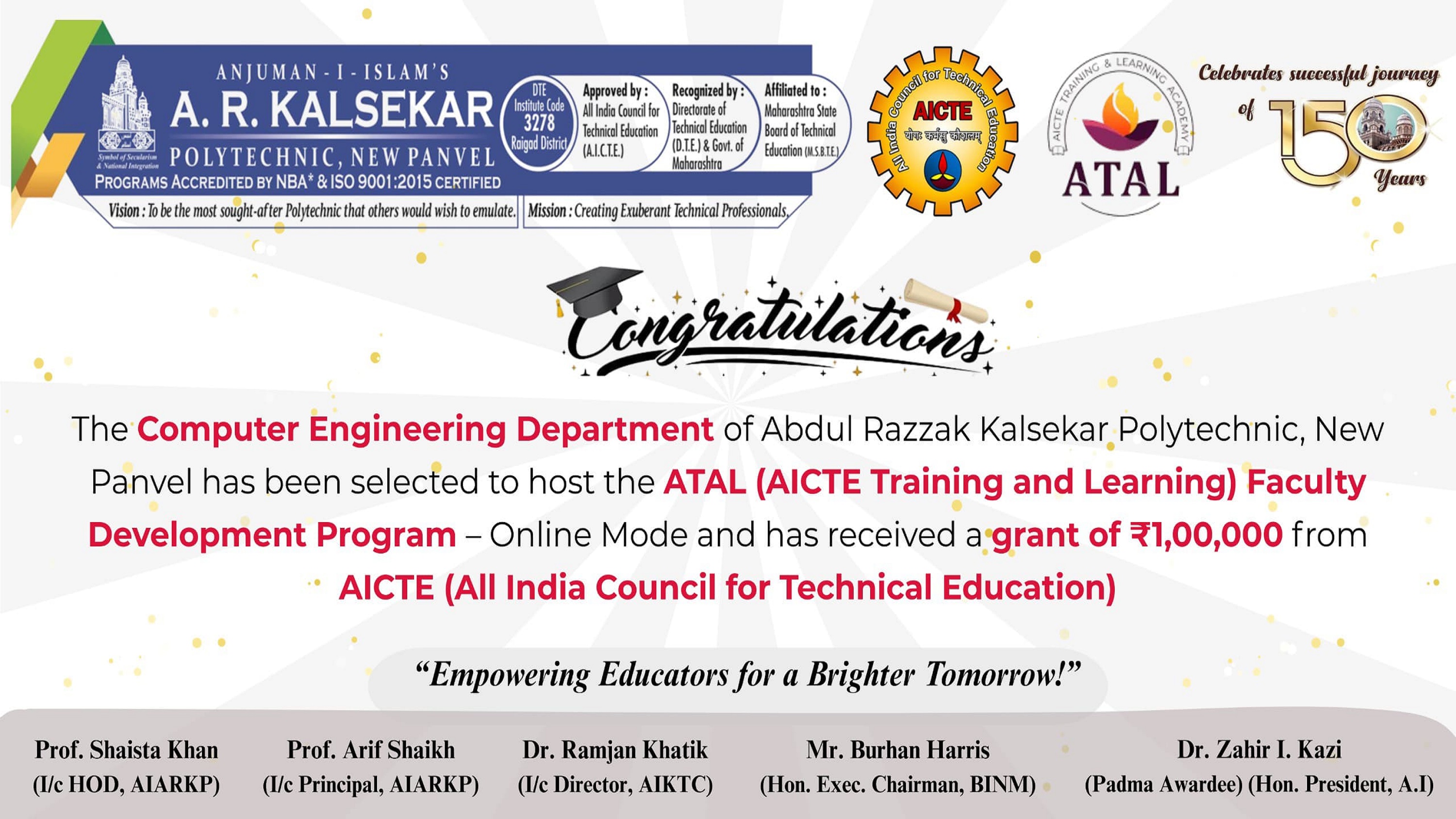 📢 Proud Moment for Computer Engineering department ARKP! ✨We are delighted to share that the Computer Engineering Department of Abdul Razzak Kalsekar Polytechnic has been selected to host an ATAL Faculty Development Program (Online Mode) and has been granted a funding of ₹100000 for the same by AICTE