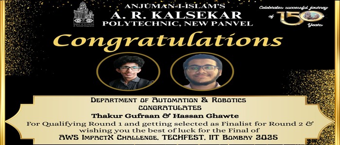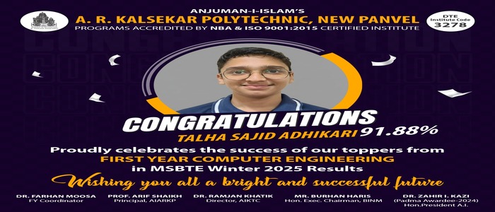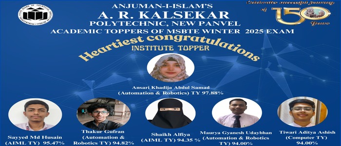 π Heartiest Congratulations to Our Academic Toppers! π Anjuman-i-Islamβs A. R. Kalsekar Polytechnic New Panvel proudly congratulates our outstanding students for their remarkable performance in the MSBTE Winter 2025 Examination. π Institute Topper π Ansari Khadija Abdul Samad (Automation & Robotics β TY) β¨ 97.88% π Students Securing Above 90% Sayyed Md Husain (AIML β TY) β 95.47% Thakur Gufran (Automation & Robotics β TY) β 94.82% Shaikh Alfiya (AIML β TY) β 94.35% Maurya Gyanesh Udaybhan (Automation & Robotics β TY) β 94.00% Tiwari Aditya Ashish (Computer β TY) β 94.00% Your hard work dedication and perseverance have brought great pride to the institute. π Wishing you all continued success and a bright future ahead! π Congratulations once again!